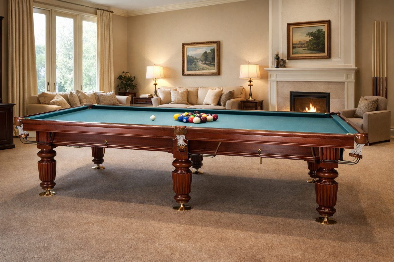 Кии, шары для пула и бильярдные аксессуары подбираются дополнительно по желанию.