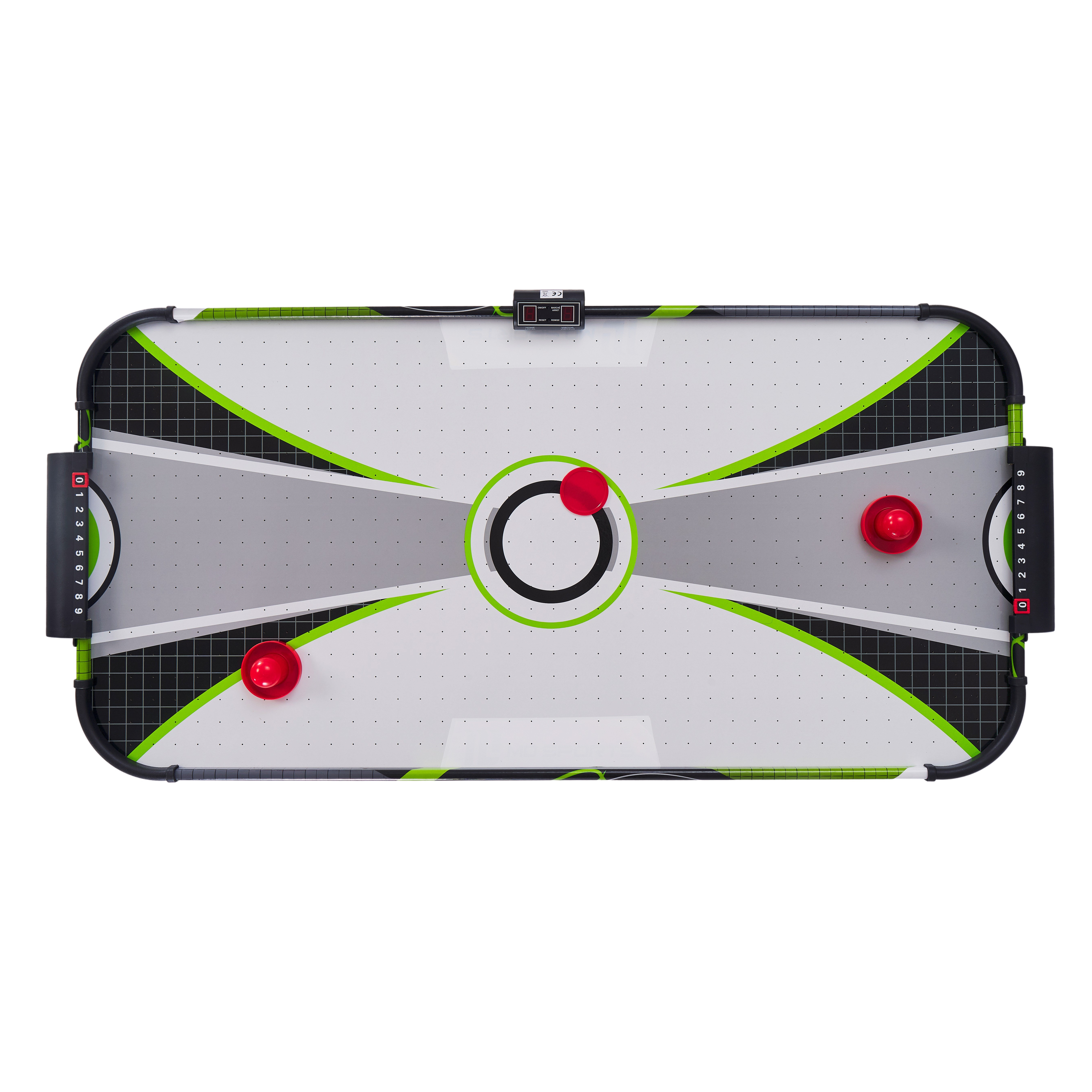 Встановлюється на підлогу, обладнано електронним табло для підрахунку забитих шайб та комплектується набором аксесуарів.