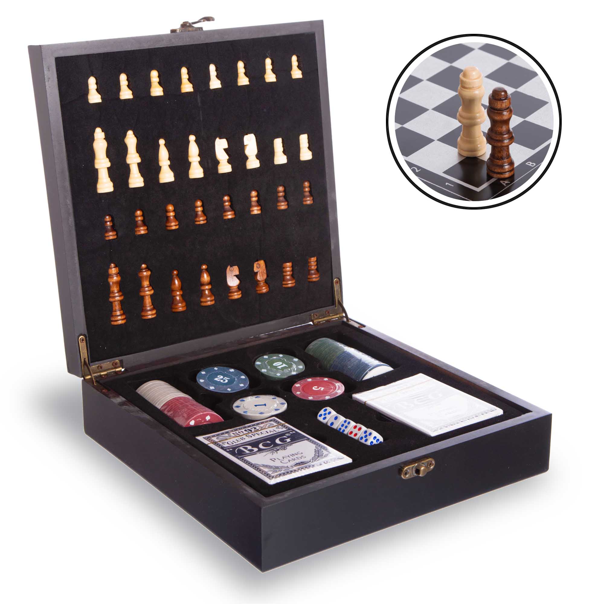 Набір Casino 3в1 шахи доміно карти Матеріал: дерево, пластик Розмір: 24x24х7 см Колір чорнийВ наб..