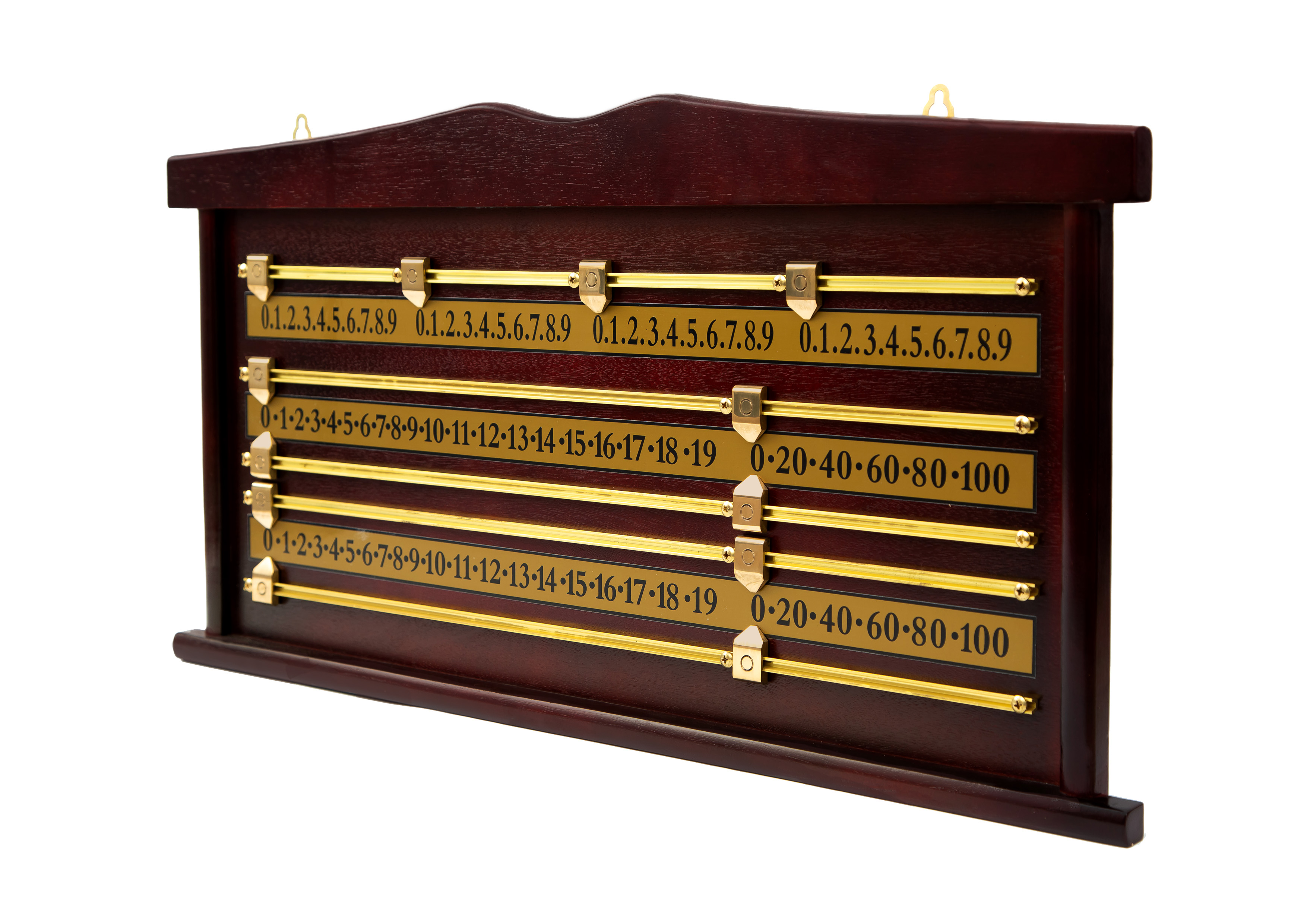 Табло оснащено кількома рядами з поділками: верхні шкали (0–9) дозволяють вести облік одиниць та десятків, а нижні — фіксувати більші значення та загальну кількість очок. Конструкція розрахована на двох гравців або 2 команди, що робить гру зручною та максимально відповідною офіційним правилам.