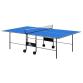 Тенісний стіл для закритих приміщень. Для ігрової поверхні використовується спеціально оброблена деревно-стружкова плита (ДСП) товщиною 16 мм. На ДСП нанесено спеціальне антиблікове пластикове покриття синього кольору. Тенісний стіл базується на компактному зручному візку, виготовленому з металевого трубчастого профілю діаметром 25 мм з поліефірним покриттям. Конструкція столу дозволяє тренуватися поодинці. Стіл легко переміщується на 4-х парних колесах діаметром 105 мм, 2 колеса маневрені.